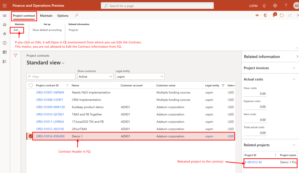 2. Contract and Projects can be edited in CE environment only. Hence, if you try to open them in F&O environment, they will open up in CE Environment.