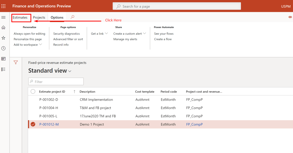 - In order to open the contract Lines in F&O environment, navigate to Project Management and Accounting àFixed-price revenue estimate projects.