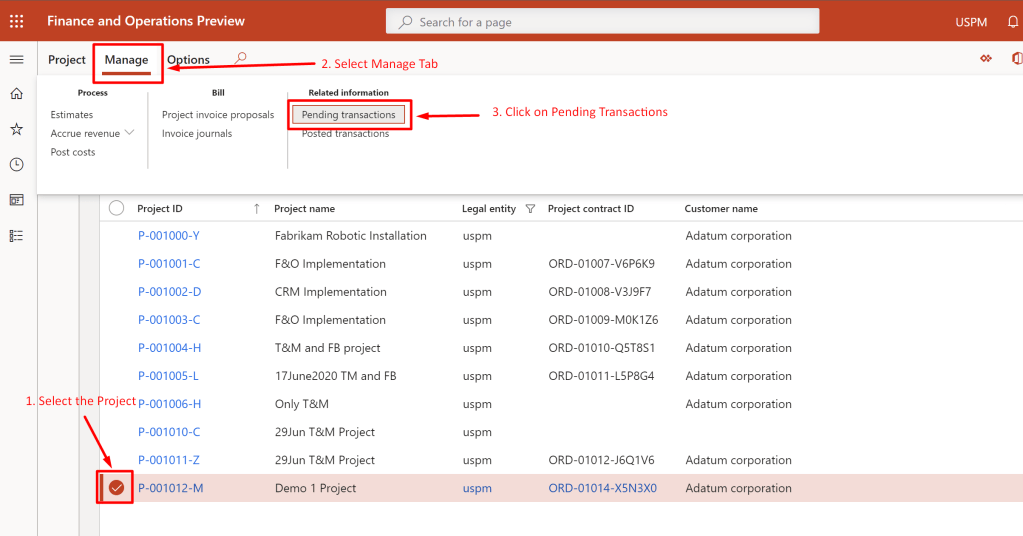 - Milestones: In order to Navigate to check the Milestones, click on Project Management and Accounting–>All Project–> select the project–> From ribbon select Pending transactions as shown below