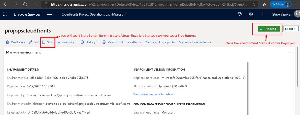 - Login to the F&O environment by logging on to http://lcs.dynamics.com and Start the environment.