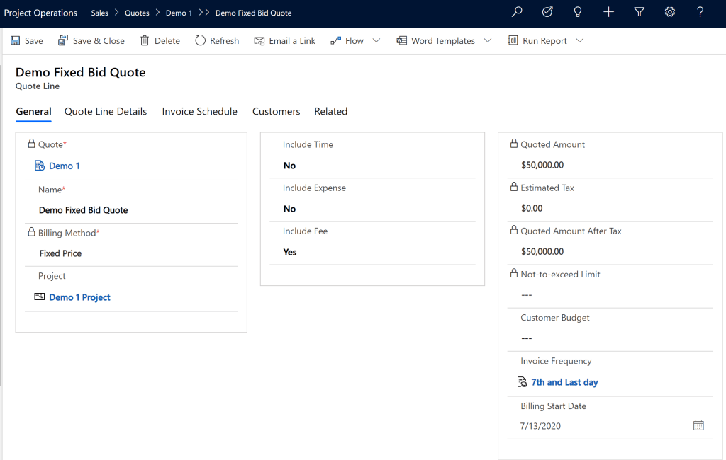 - Click on the Quote lines tab and create Quote Lines as we used to create in PSA. We will add 2 Quote lines, 1 for Fixed Bid and 1 for Time and Material.