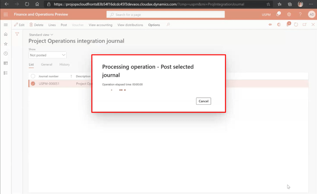 To check the same in F&O environment navigate to Project Management and Accounting Module –> Pending project transactions
