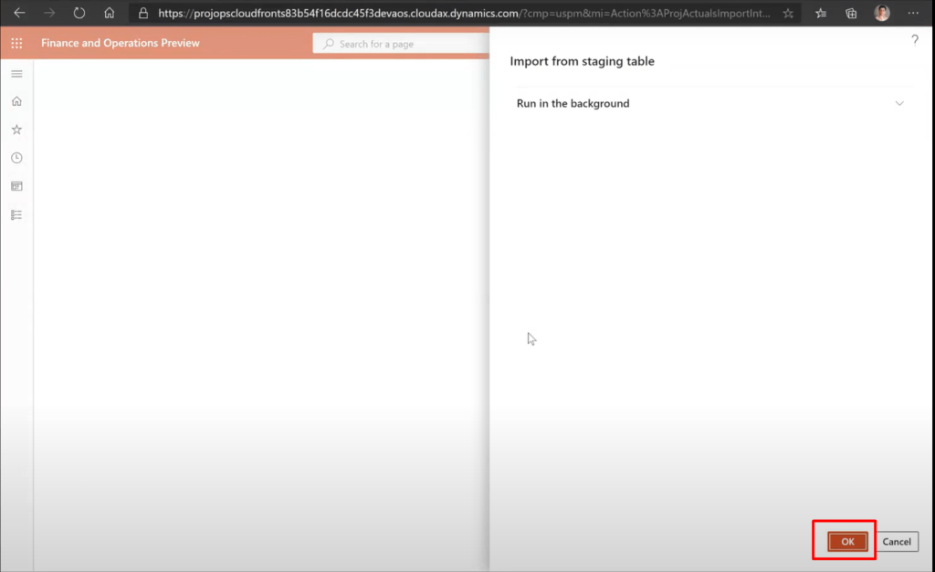 Navigate to F&O Environment and go to Project Management and Accounting –> Import from staging table.