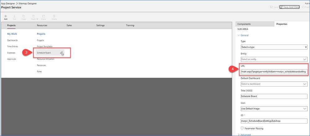 - On the right pane of the Site Map Settings, update the URL to “/main.aspx?pagetype=entitylist&etn=msdyn_scheduleboardsetting” as shown in the image below: