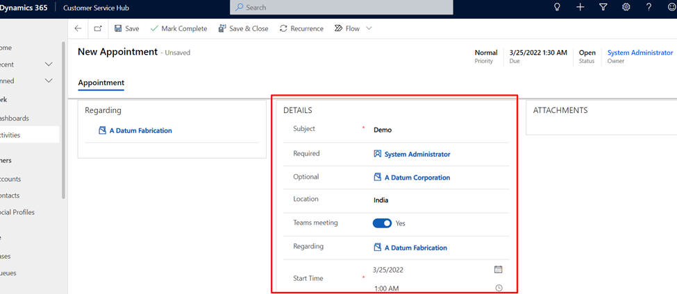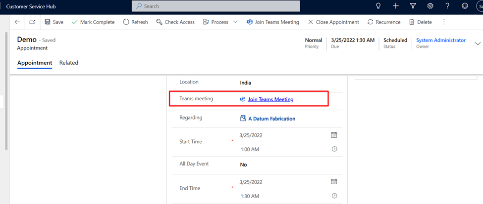 By including this feature, you can easily add Microsoft Teams meeting from an appointment in your model-driven app. Also, you can also join a Teams meeting with a single click from the appointment or the timeline control.
