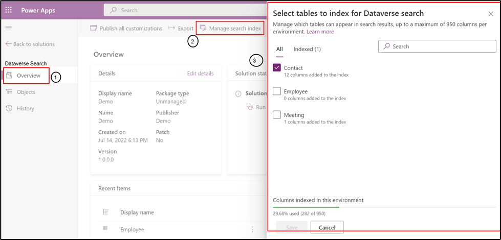 It will show us all the tables which are present in the current solution. When users select the tables for indexing, it will show the number of fields that are included in Dataverse Search. These columns are dependent on the Quick Find View. The limit for Columns indexed in this environment is maximum 950 per organization. Users can enable or disable indexing for a specific table from here and can adjust which columns are included in Dataverse Search within the Power Apps portal.