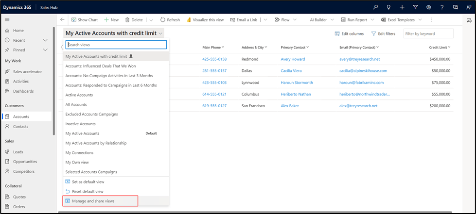 In the view selector, the Manage and share views option is available