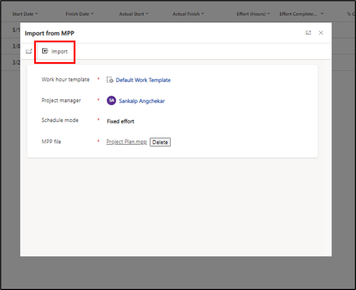 - A dialog box will pop up on the screen, in which you must add your work hour template, the Project Manager and the even choose the MPP file to be imported.