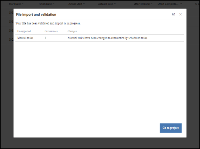 - After clicking import you will get a validation screen if your project has been successfully imported. This screen will define all the items that are excluded during the import.
