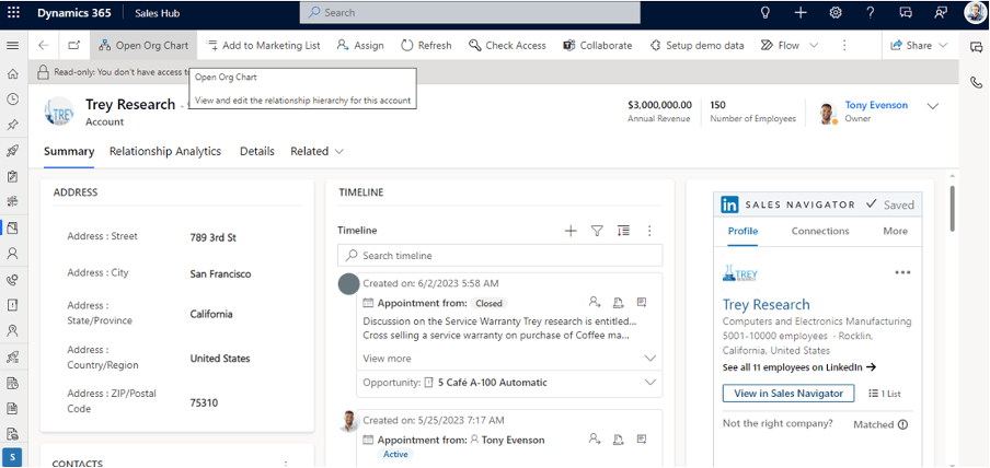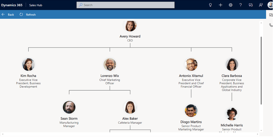 - Live Org Chart Visibility allows salesperson to quickly connect multiple Contacts to an Account and build a personnel hierarchy highlighting the Contact’s designation and who they report to.