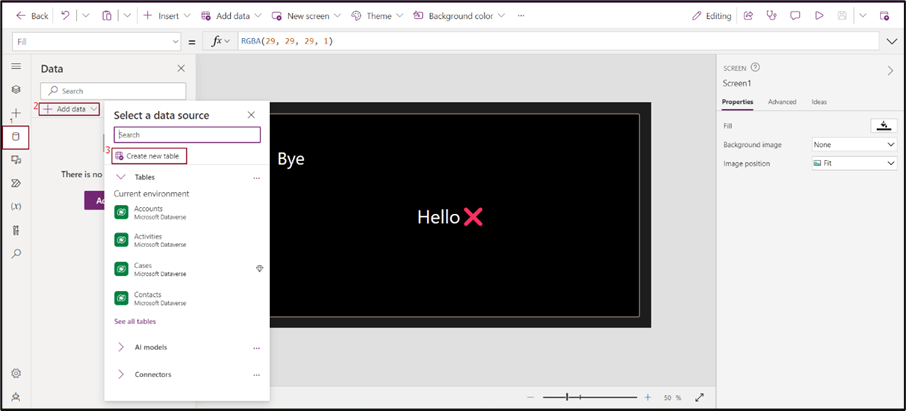 - Create a canvas app >> click on the expand menu button >> select data >> Add data >> Create new table.