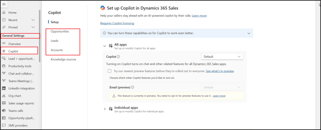 - In Sales Hub à Change Area à App Settings à under General Settings, select Copilot.