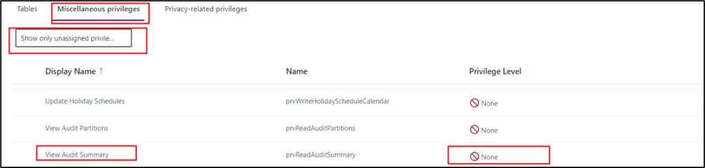 - Select Settings à Users + Permissions à Security Roles à Select the role assigned to your sellers/users à select Miscellaneous Privileges tab à select Show only unassigned privileges.