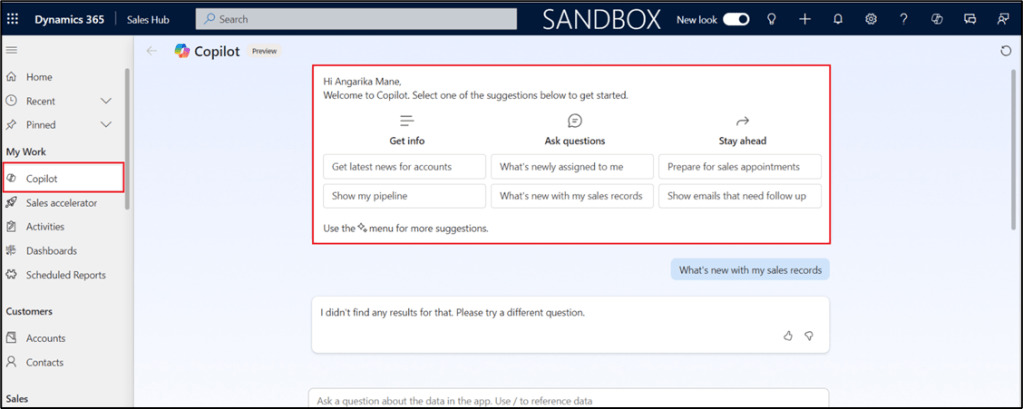 - Information Assistance: Copilot can provide additional context or information related to recent changes. For example, if a contact’s email address has been updated, Copilot might suggest verifying the accuracy or checking for any associated activities.