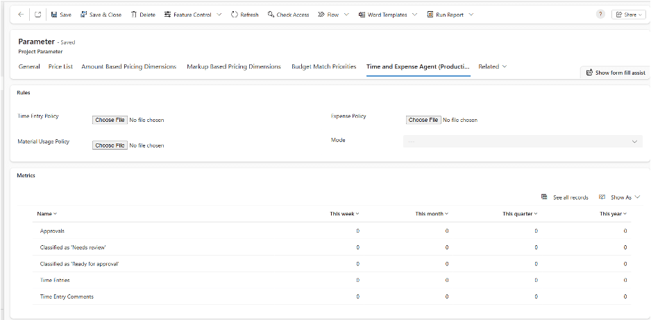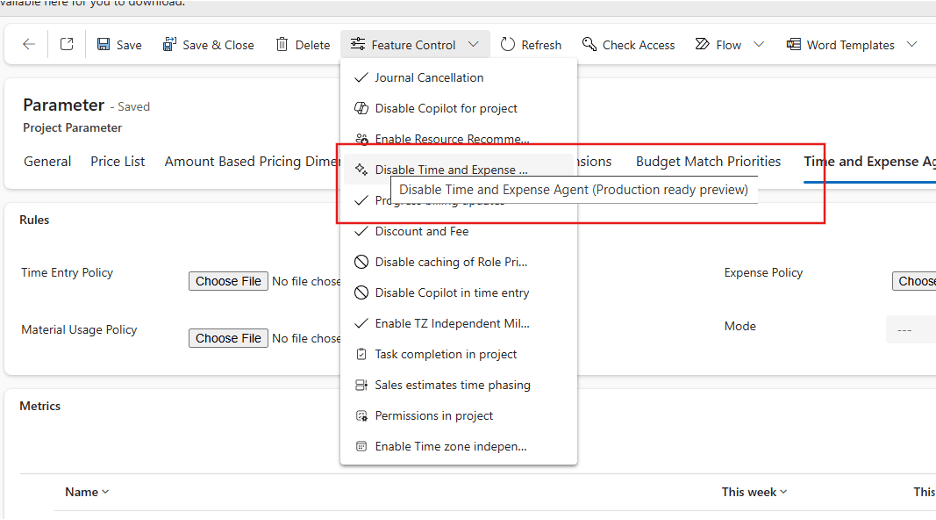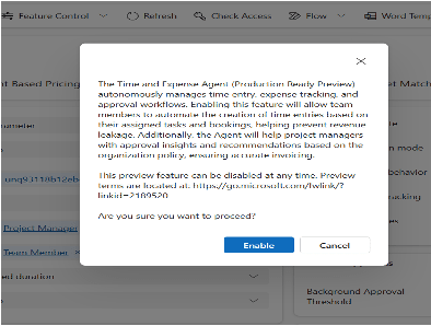 - Admins enable the Time and Expense Agent from Project Parameters → Feature Control.