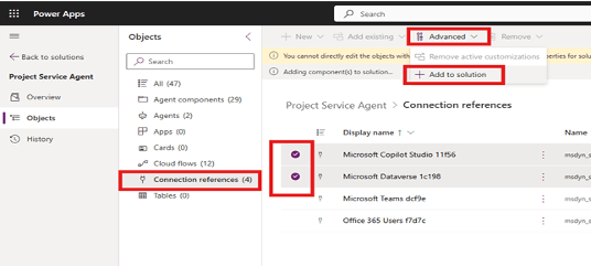 - Select Solution -> Managed Solution -> Open Project Service Agent -> Objects -> Connection reference -> select Microsoft Copilot Studio and Microsoft Dataverse connection references -> add to default solution and save