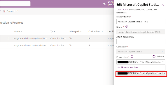 - Go to Default solution ->Object -> Connection reference -> Select Microsoft Copilot Studio, and then select Edit on the command bar