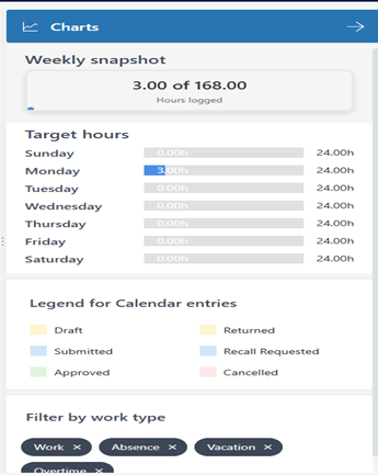 - Expand Charts for a snapshot: total logged vs. target hours, daily trends.